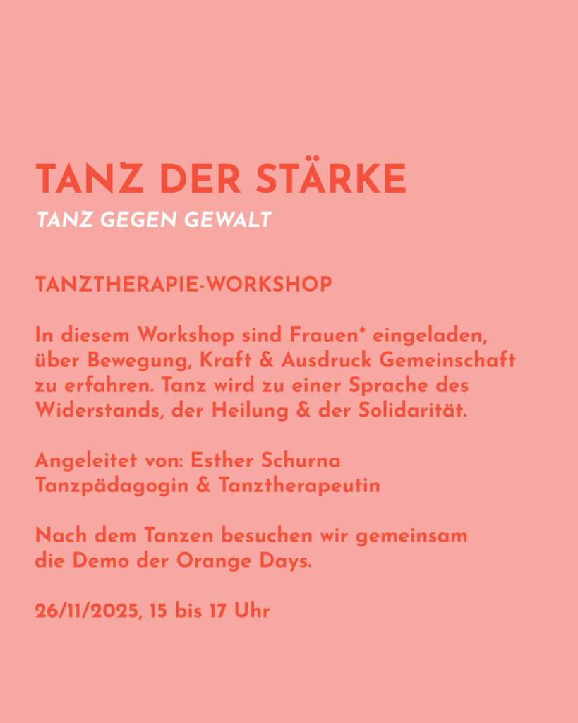 Gemeinsam mit der Tanzpädagogin & Tanztherapeutin Esther Schurna entdecken die Teilnehmerinnen den Körper als Quelle von Stärke, Selbstbestimmung & Lebendigkeit – & setzen ein sichtbares Zeichen gegen Gewalt an Frauen.