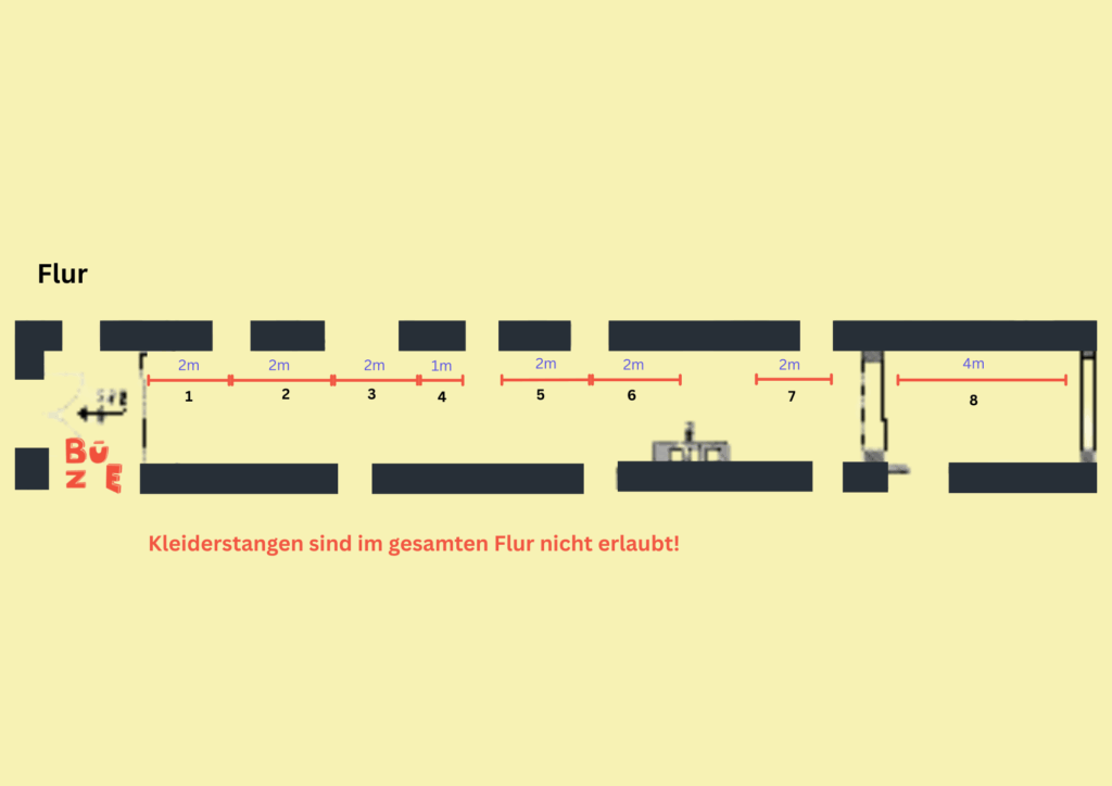 Der Plan zeigt alle Standflächen im Flur. Du kannst zwischen 1m, 2m oder 4m Standbreite wählen. Die genaue Platzzuweisung erfolgt vor Ort in der Reihenfolge der Ankunft. Der 1m-Stand (Nr.6) sowie der 4m-Stand (Nr.8) sind davon ausgenommen.