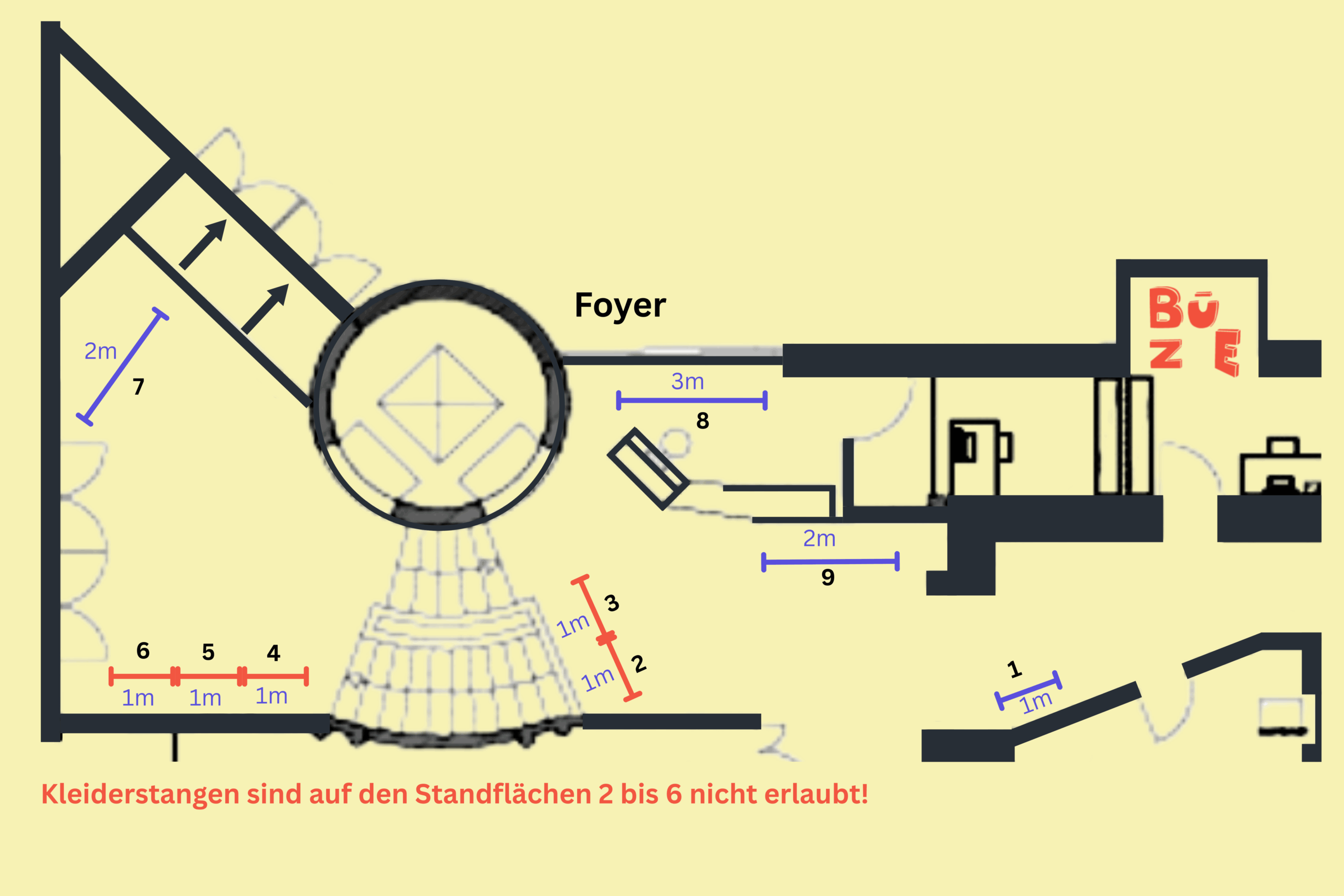 Bitte beachtet: Kleiderstangen sind auf den Standflächen 2 bis 6 nicht erlaubt.