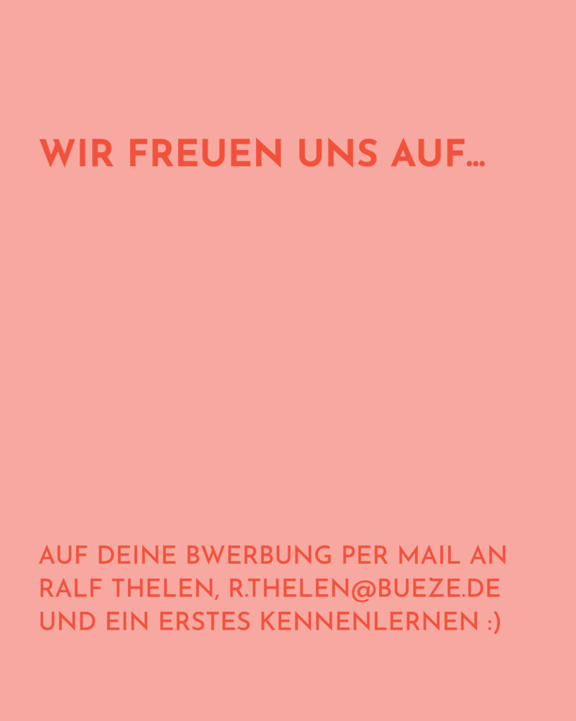 Hier findest du Jobangebote bei uns im BüzE. Sollte die ausgeschriebene Stelle zu dir passen & du hast Lust Teil unseres Teams zu werden, freuen wir uns sehr dich kennenzulernen.